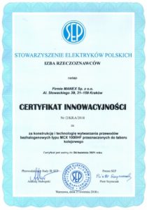 - Certyfikat zgodności dla wyrobu MXC – PN-EN 45545-2:2013+A1:2015.